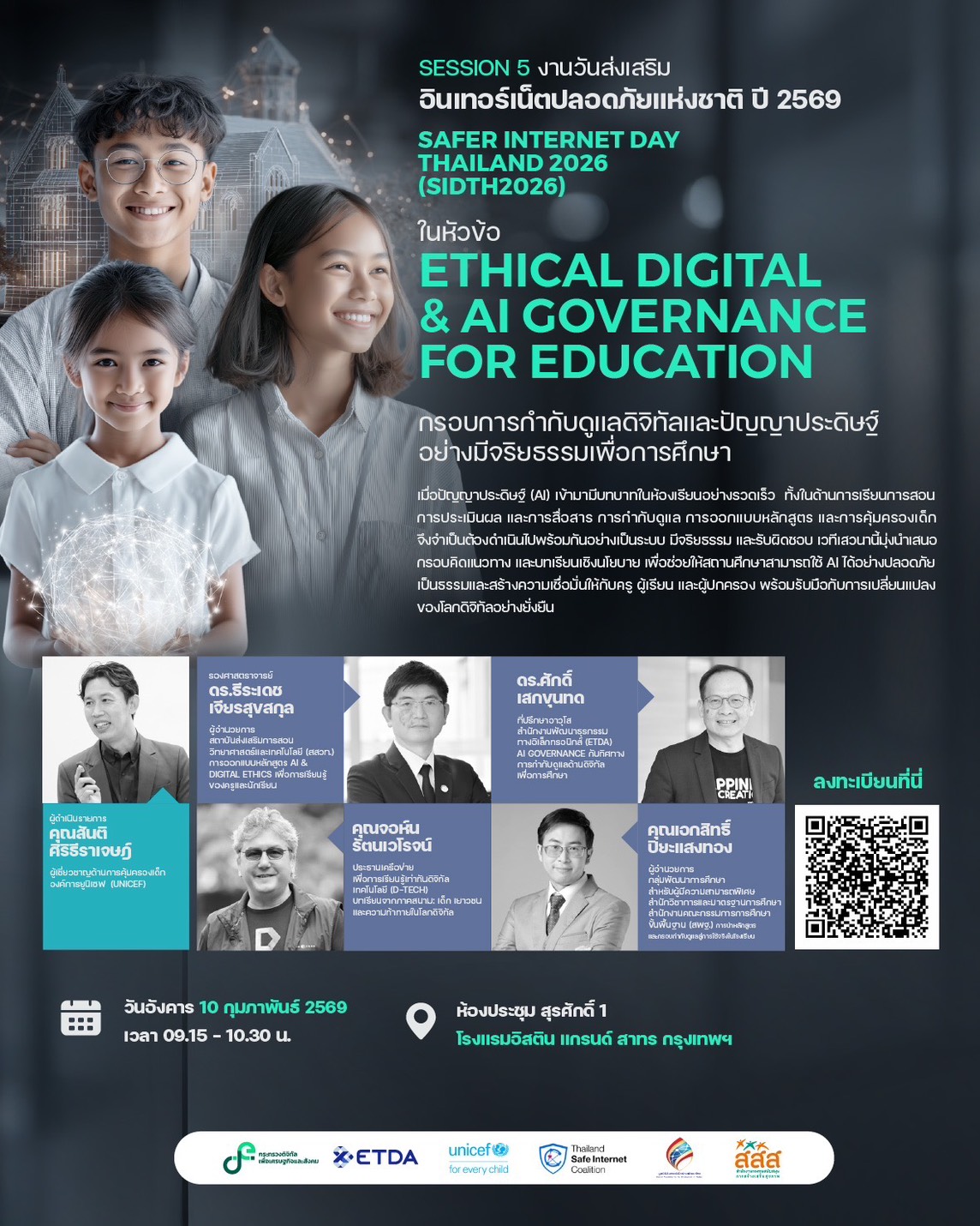 สถาบันส่งเสริมการสอนวิทยาศาสตร์และเทคโนโลยี (สสวท.) ร่วมส่งเสริมอินเตอร์เน็ตปลอดภัยขอเชิญผู้สนใจร่วมรับฟังการเสวนาเนื่องในงานวันส่งเสริมอินเตอร์เน็ตปลอดภัยแห่งชาติ ปี 2569หัวข้อ “Ethical Digital AI Government for Education กรอบการกำกับดูแลดิจิทัลและปัญญาประดิษฐ์อย่างมีจริยธรรมเพื่อการศึกษา” จัดโดย สำนักงานพัฒนาธุรกรรมทางอิเล็กทรอนิกส์ (ETDA)
