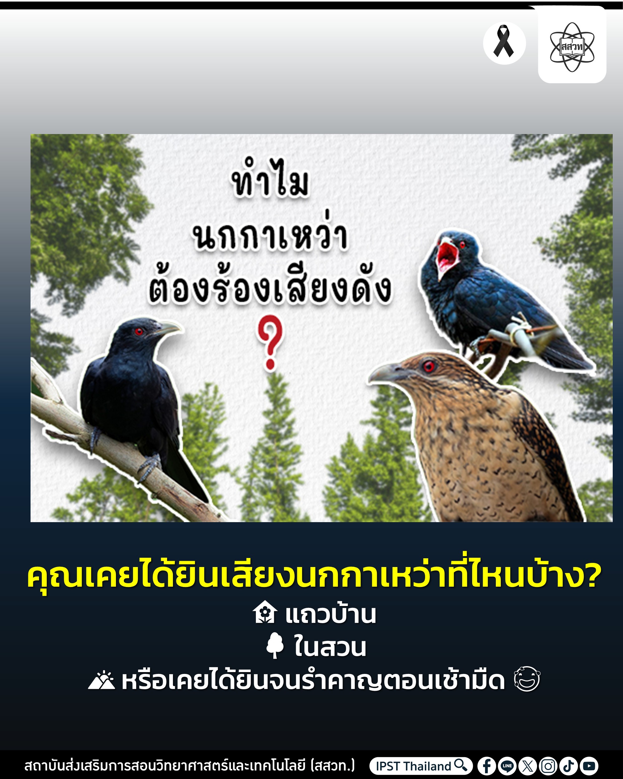 สุดท้ายนี้ นกกาเหว่าฝากมาว่า อย่าเพิ่งรำคาญเสียงผมเลย ผมร้องเพราะผมเหงาจัง อยากมีแฟน อีกอย่างผมก็อยากประกาศให้เพื่อนนกตัวอื่น ๆ รู้ด้วยว่า นี่คือดินแดนของผมนะ ผมก็ร้องของผมตามธรรมชาติของนกกาเหว่าตัวผู้ ถ้าผมเป็นกตัวเมีย ผมก็จะเรียบร้อยกว่านี้ ไม่ร้องเสียงดังโหวกเหวกให้เป็นที่น่ารำคาญ แต่ถ้าเงี่ยหูฟังดีๆ ผมไม่ได้ร้องอยู่ตัวเดียวนะครับ ยังมีเพื่อนนกอื่น ๆ อยู่ใกล้ ๆ นะ หากอยากรู้ว่าเป็นนกอะไรบ้าง ลองดาวน์โหลดแอปพลิเคชัน BirdNET จาก Google Play Store (ระบบ Android) หรือ App Store (ระบบ iOS) มาเพื่อบันทึกเสียงนกและวิเคราะห์เสียง หรือถ้าอยากฟังเสียงนกชนิดต่าง ๆ จากทั่วโลก ศึกษาได้จาก xeno-canto เป็นฐานข้อมูลที่เก็บรวบรวมเสียงนกและข้อมูลการกระจายพันธุ์ของนกมากกว่า 10,000 สปีชีส์ รวมทั้งเสียงสัตว์ป่าอื่น ๆ อีกด้วย (อ่านต่อได้ที่นิตยสาร สสวท. https://emagazine.ipst.ac.th/241/20/)