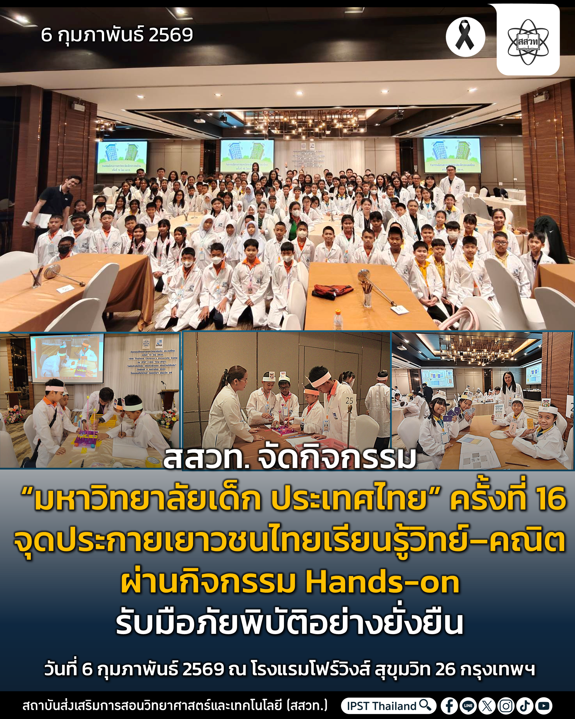 สถาบันส่งเสริมการสอนวิทยาศาสตร์และเทคโนโลยี (สสวท.) จัดกิจกรรม โครงการมหาวิทยาลัยเด็ก ประเทศไทย ครั้งที่ 16 ภายใต้แนวคิด “ผนึกกำลังตั้งรับ ปรับตัวสู่วิกฤต เพื่อชีวิตที่ยั่งยืน” (The 16th Thailand Children’s University Camp by IPST) เพื่อเปิดพื้นที่การเรียนรู้รูปแบบใหม่ให้เยาวชนไทยได้สนุกกับวิทยาศาสตร์และคณิตศาสตร์ ผ่านการลงมือทำจริงในสถานการณ์ใกล้ตัว พร้อมเสริมทักษะสำคัญในการรับมือกับเหตุการณ์ไม่คาดคิดในอนาคต เมื่อวันที่ 6 กุมภาพันธ์ 2569 ณ โรงแรมโฟร์วิงส์ สุขุมวิท 26 กรุงเทพฯ