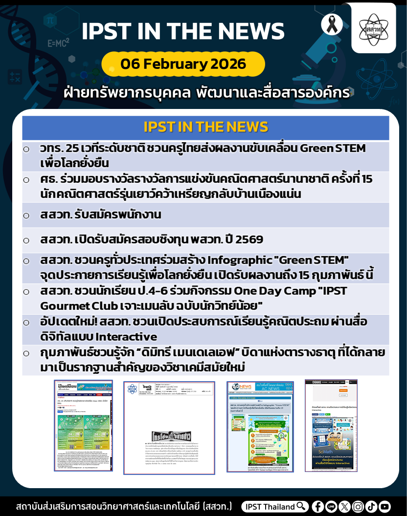 สถาบันส่งเสริมการสอนวิทยาศาสตร์และเทคโนโลยี (สสวท.) ได้ดำเนินงานตามภารกิจอย่างต่อเนื่อง รวมถึงได้ประชาสัมพันธ์ข่าวสารเพื่อให้ครู นักเรียน ผู้ปกครอง และประชาชนทั่วไป ได้รับทราบ เข้าถึงสื่อ ผลงาน กิจกรรม และข่าวต่าง ๆ สสวท. ขอประชาสัมพันธ์ข่าวประจำสัปดาห์ (IPST IN THE NEWS) ระหว่างวันที่ 2 – 6 กุมภาพันธ์ 2569 รายละเอียดดังนี้