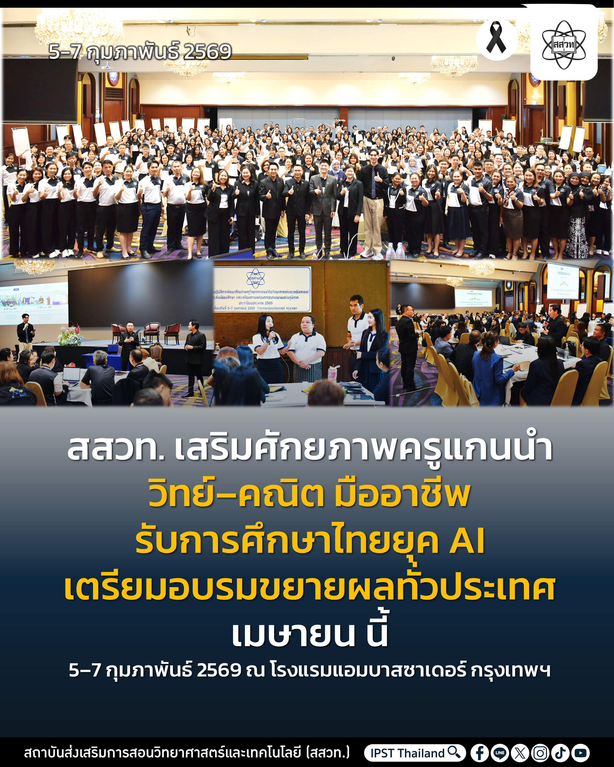รองศาสตราจารย์ ดร.ธีระเดช เจียรสุขสกุล ผู้อำนวยการสถาบันส่งเสริมการสอนวิทยาศาสตร์และเทคโนโลยี (สสวท.) เป็นประธานเปิดการอบรมเชิงปฏิบัติการพัฒนาศักยภาพครูวิทยากรแกนนำวิชาวิทยาศาสตร์และคณิตศาสตร์ ระดับมัธยมศึกษา และเตรียมความพร้อมการอบรมขยายผลในภูมิภาค ประจำปี 2569 และบรรยายพิเศษในหัวข้อ “สสวท. กับการขับเคลื่อนการศึกษา SMT ในยุคปัญญาประดิษฐ์” โดยการอบรมจัดขึ้นระหว่างวันที่ 5 – 7 กุมภาพันธ์ 2569 ณ โรงแรมแอมบาสซาเดอร์ กรุงเทพฯ โดยมีครูวิทยากรแกนนำและครูเครือข่ายโครงการส่งเสริมการผลิตครูที่มีความสามารถพิเศษทางวิทยาศาสตร์และคณิตศาสตร์ (สควค.) ร่วมอบรม จำนวน 200 คน