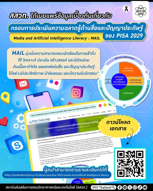 สถาบันส่งเสริมการสอนวิทยาศาสตร์และเทคโนโลยี (สสวท.) เผยแพร่ข้อมูลเบื้องต้นเกี่ยวกับ “กรอบการประเมินความฉลาดรู้ด้านสื่อและปัญญาประดิษฐ์ (Media and Artificial Intelligence Literacy: MAIL) ของ PISA 2029” ผ่านเว็บไซต์ PISA Thailand สสวท. เพื่อสนับสนุนการเตรียมความพร้อมของนักเรียน ครู และสถานศึกษา ในการพัฒนาทักษะสำคัญแห่งศตวรรษที่ 21 โดยมุ่งเน้นความสามารถของนักเรียนในการเข้าถึง ใช้ วิเคราะห์ ประเมิน สร้างสรรค์ และมีส่วนร่วมกับเนื้อหาดิจิทัล แพลตฟอร์มสื่อ เทคโนโลยี และปัญาประดิษฐ์ ได้อย่างมีประสิทธิภาพ มีจริยธรรม และความรับผิดชอบ รวมถึงเพื่อทำความเข้าใจสาระสำคัญของกรอบการประเมินดังกล่าวอย่างครบถ้วน ผู้สนใจสามารถศึกษาเพิ่มเติมได้ที่ https://pisathailand.ipst.ac.th/about-pisa/pisa-2029-media-and-artificial-intelligence-literacy/