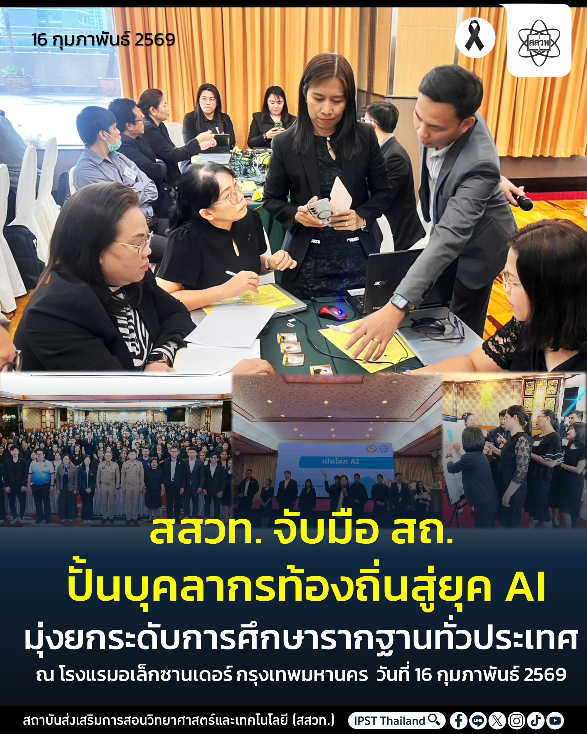 สถาบันส่งเสริมการสอนวิทยาศาสตร์และเทคโนโลยี (สสวท.) ร่วมกับกรมส่งเสริมการปกครองท้องถิ่น (สถ.) จัดโครงการอบรมเชิงปฏิบัติการพัฒนาศักยภาพบุคลากรด้านปัญญาประดิษฐ์ (AI) รุ่นที่ 5 เพื่อขับเคลื่อนการเรียนรู้ในสถานศึกษาสังกัดองค์กรปกครองส่วนท้องถิ่น ณ โรงแรมอเล็กซานเดอร์ กรุงเทพฯ เมื่อวันที่ 16 กุมภาพันธ์ 2569 โดยได้รับเกียรติจาก นายธีรุตม์ ศุภวิบูลย์ผล อธิบดีกรมส่งเสริมการปกครองท้องถิ่น เป็นประธานในพิธีเปิด โดยมี นายพลวัฒน์ การุญภาสกร ผู้อำนวยการกองส่งเสริมและพัฒนาการจัดการศึกษาท้องถิ่น ให้การต้อนรับ พร้อมด้วย ดร.จีระพร สังขเวทัย ผู้อำนวยการสาขาเทคโนโลยี และนักวิชาการ สสวท. ร่วมเป็นวิทยากรให้คำแนะนำใกล้ชิดให้แก่ผู้เข้าร่วมอบรม มุ่งเน้นการวางรากฐานทางเทคโนโลยีให้แก่สถานศึกษาขั้นพื้นฐานทั่วประเทศ เพื่อให้บุคลากรทางการศึกษาสามารถนำนวัตกรรม AI ไปประยุกต์ใช้ในการเรียนการสอนอย่างมีประสิทธิภาพและเท่าทันต่อการเปลี่ยนแปลงในโลกยุคดิจิทัล