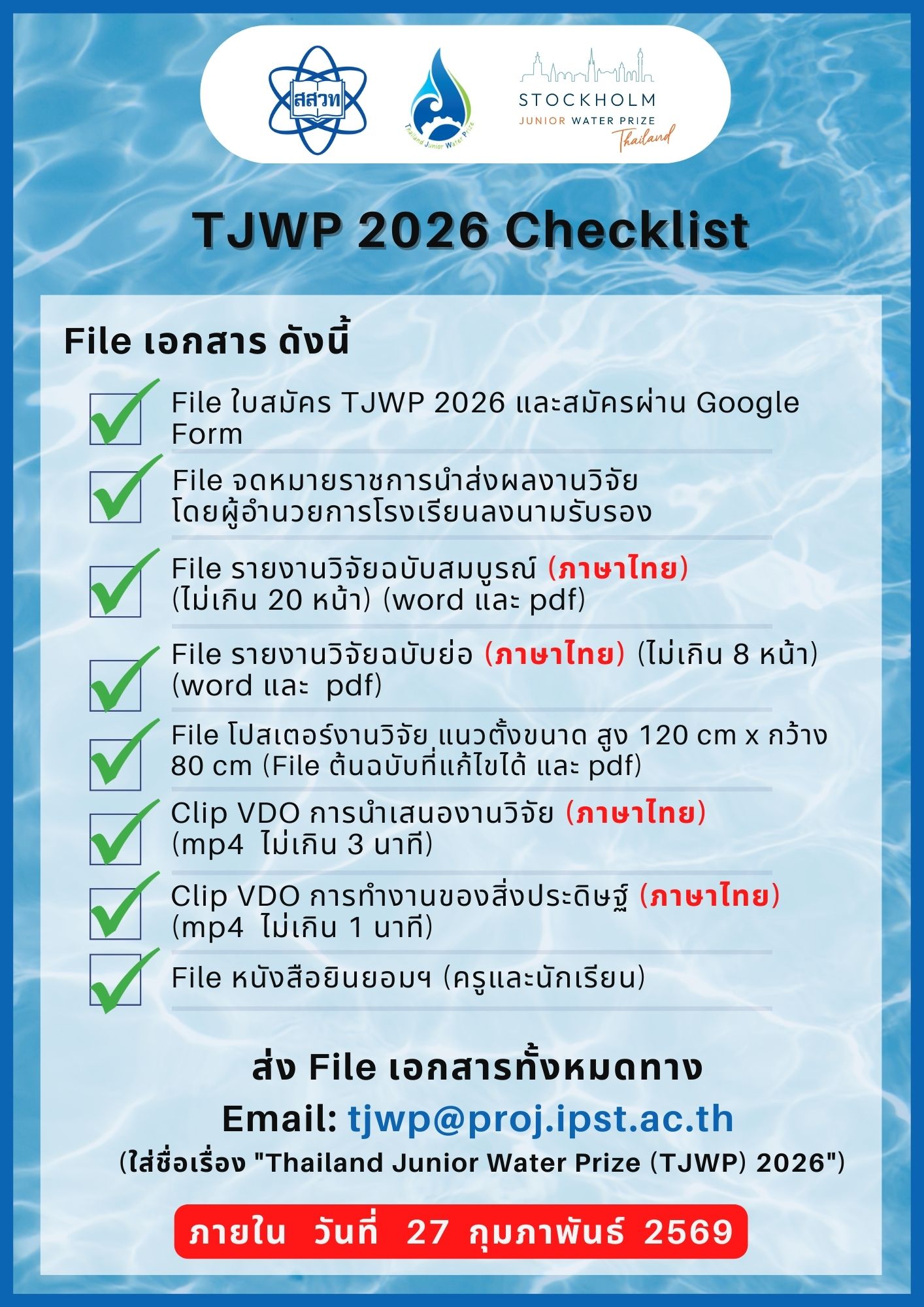 สถาบันส่งเสริมการสอนวิทยาศาสตร์และเทคโนโลยี (สสวท.) เปิดรับสมัครนักเรียนระดับมัธยมศึกษาทั่วประเทศ อายุ 15–18 ปี เข้าร่วมการประกวดสิ่งประดิษฐ์และนวัตกรรมในการอนุรักษ์ทรัพยากรน้ำ ปี 2569 “Thailand Junior Water Prize 2026 (TJWP 2026)” ภายใต้แนวคิด Water for People and Progress เพื่อเฟ้นหาผลงานวิจัยและนวัตกรรมที่ช่วยแก้ปัญหาคุณภาพน้ำ สิ่งแวดล้อม และส่งเสริมการใช้น้ำอย่างยั่งยืน โดยแต่ละโรงเรียนสามารถส่งผลงานได้ไม่เกิน 1 ทีม (นักเรียน 2 คน และครูที่ปรึกษา 1 คน) เปิดรับสมัครตั้งแต่วันนี้จนถึง 27 กุมภาพันธ์ 2569 ผู้ชนะเลิศจะได้เป็นตัวแทนประเทศไทยเข้าร่วมการประกวด Stockholm Junior Water Prize 2026 ณ ราชอาณาจักรสวีเดน สนใจสามารถส่งเอกสารการสมัครที่อีเมล tjwp@proj.ipst.ac.th ลงทะเบียนออนไลน์ได้ที่ https://shorturl.at/YgIWI ดูรายละเอียดเพิ่มเติมได้ที่ https://globethailand.ipst.ac.th/news_detail.php?nv=137 และ Facebook: GLOBE Thailand Official