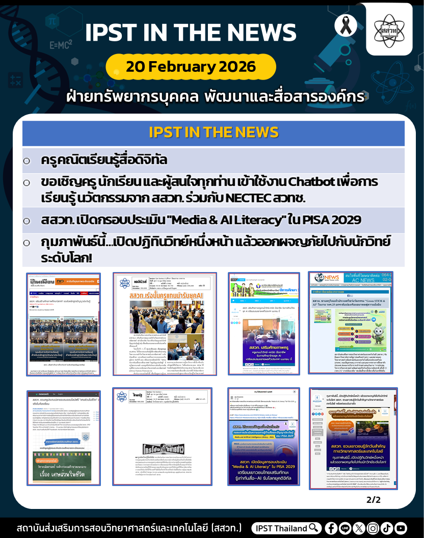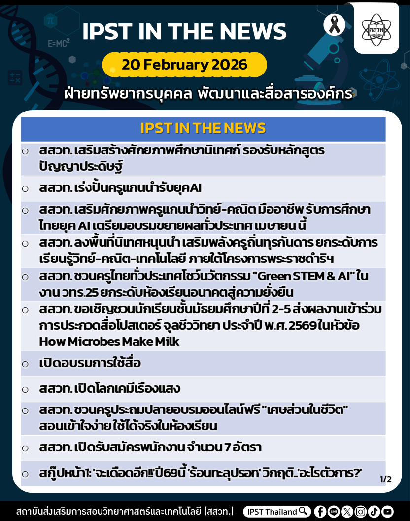 สถาบันส่งเสริมการสอนวิทยาศาสตร์และเทคโนโลยี (สสวท.) ได้ดำเนินงานตามภารกิจอย่างต่อเนื่อง รวมถึงได้ประชาสัมพันธ์ข่าวสารเพื่อให้ครู นักเรียน ผู้ปกครอง และประชาชนทั่วไป ได้รับทราบ เข้าถึงสื่อ ผลงาน กิจกรรม และข่าวต่าง ๆ สสวท. ขอประชาสัมพันธ์ข่าวประจำสัปดาห์ (IPST IN THE NEWS) ระหว่างวันที่ 16-20 กุมภาพันธ์ 2569 รายละเอียดดังนี้