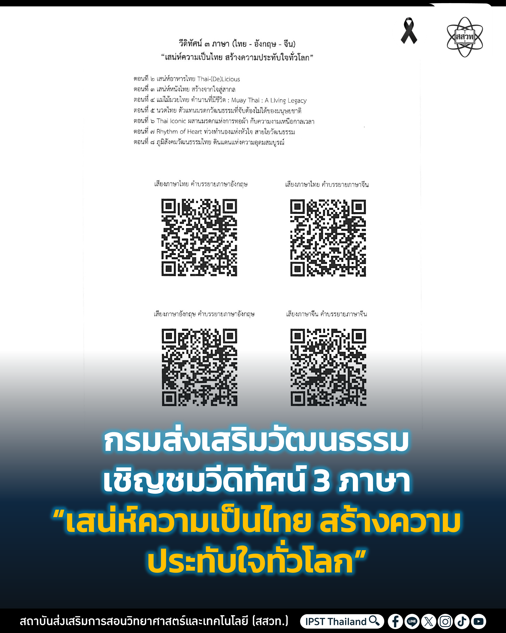 กรมส่งเสริมวัฒนธรรม กระทรวงวัฒนธรรม ขอเชิญชวนประชาชน หน่วยงาน และสถานศึกษา ร่วมรับชมวีดิทัศน์ 3 ภาษา (ไทย–อังกฤษ–จีน) ภายใต้แนวคิด “เสน่ห์ความเป็นไทย สร้างความประทับใจทั่วโลก” ซึ่งจัดทำขึ้นเพื่อถ่ายทอดคุณค่าอัตลักษณ์และมรดกภูมิปัญญาทางวัฒนธรรมไทยสู่สายตานานาชาติ เสริมสร้างภาพลักษณ์ประเทศไทยในเวทีโลก วีดิทัศน์ชุดดังกล่าวจัดทำจำนวน 8 ตอน (4 รูปแบบภาษา) นำเสนอเนื้อหาครอบคลุมมิติทางประวัติศาสตร์ วิถีชีวิต ศิลปวัฒนธรรม อาหาร กีฬา และพลังสร้างสรรค์ของสังคมไทย ประกอบด้วย