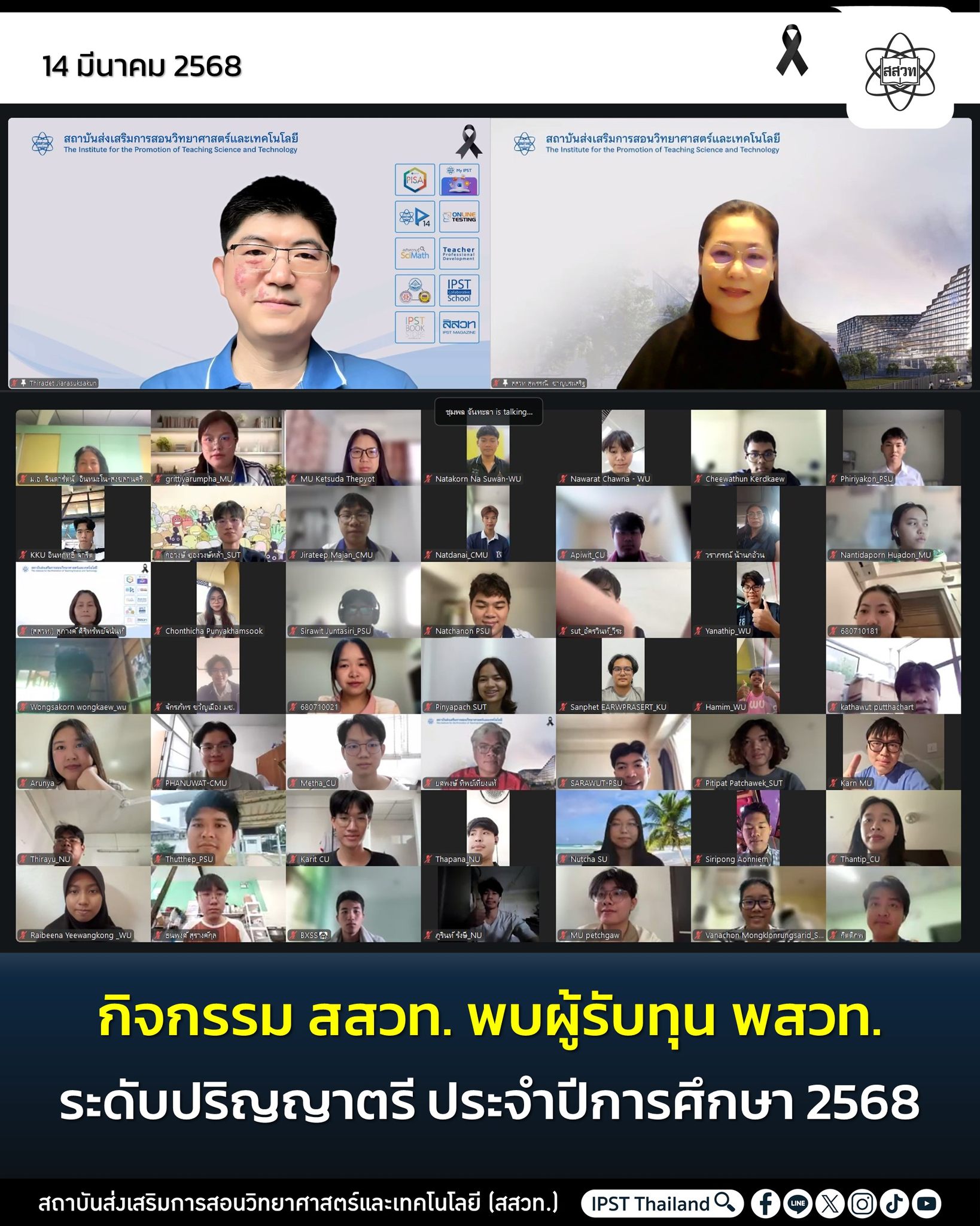 สถาบันส่งเสริมการสอนวิทยาศาสตร์และเทคโนโลยี (สสวท.) จัดกิจกรรม สสวท.พบผู้รับทุน พสวท. ระดับปริญญาตรี ประจำปีการศึกษา 2568 เมื่อวันเสาร์ที่ 14 มีนาคม 2569 เวลา 08.30 – 12.00 น.ในรูปแบบออนไลน์