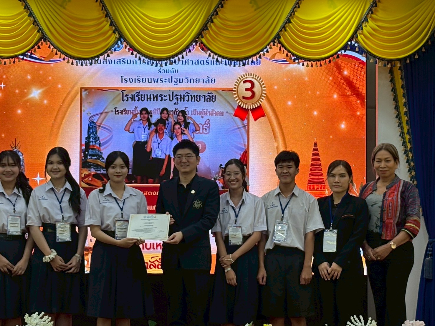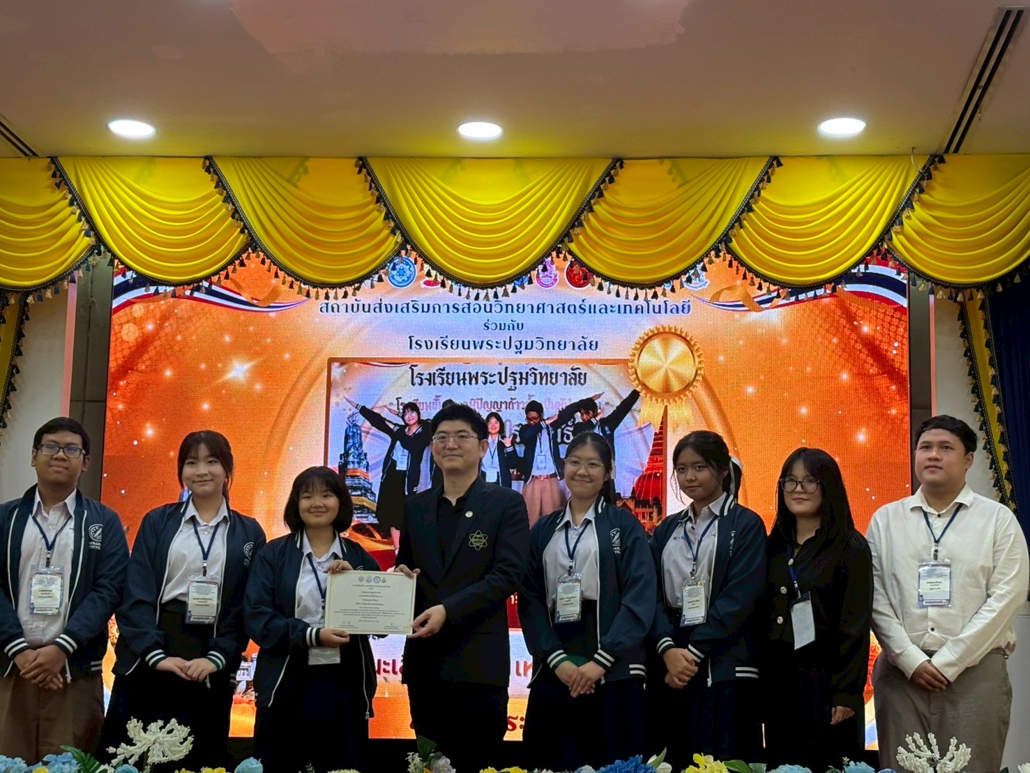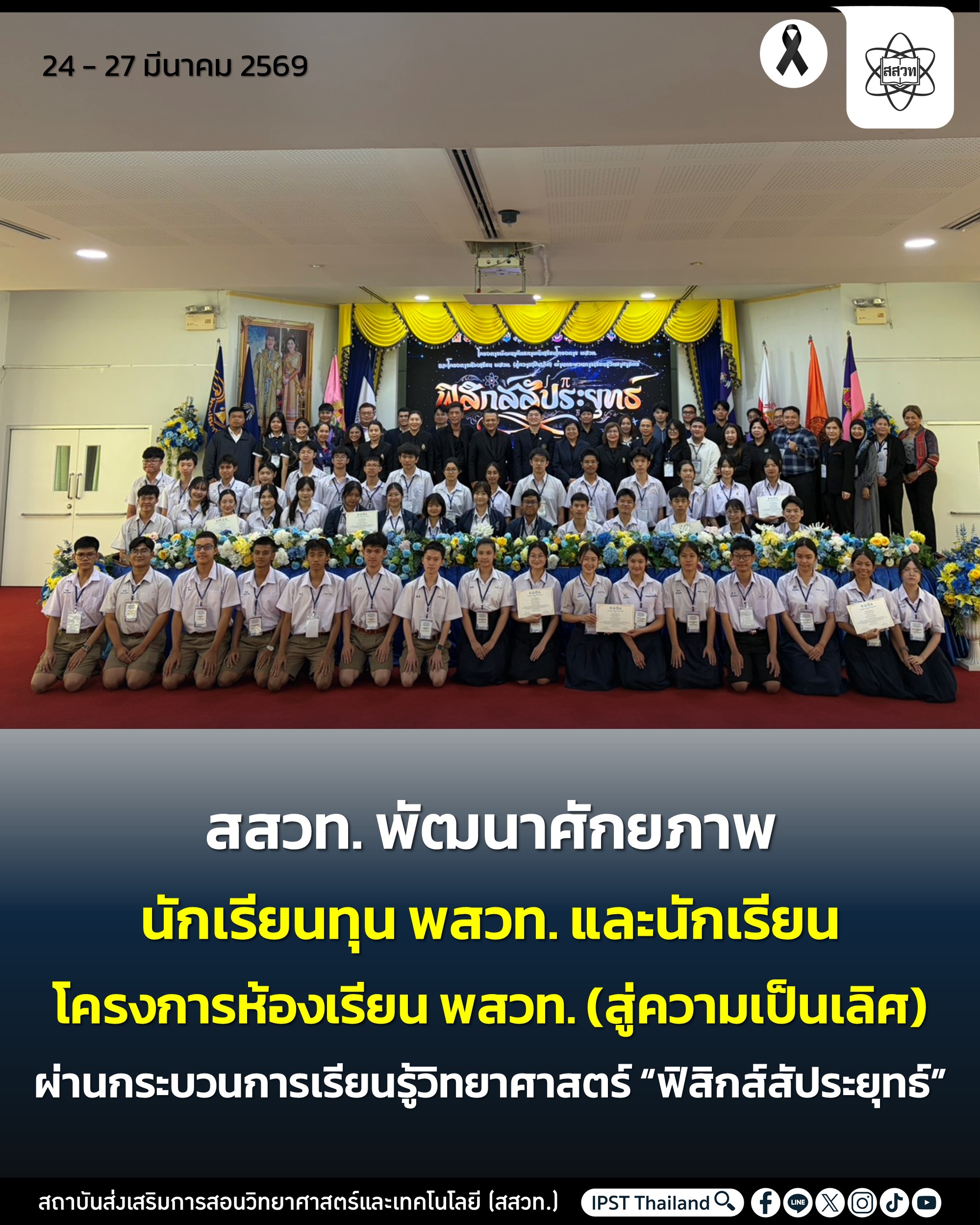 เป็นประธานในพิธีมอบรางวัลและกล่าวแสดงความยินดีแก่นักเรียนผู้เข้าร่วมกิจกรรม “ฟิสิกส์สัประยุทธ์” ประจำปี พ.ศ. 2569 จัดโดย สสวท. ร่วมกับโรงเรียนพระปฐมวิทยาลัย ระหว่างวันที่ 24 – 27 มีนาคม 2569 ณ โรงเรียนพระปฐมวิทยาลัย จังหวัดนครปฐม ภายใต้โครงการพัฒนาศักยภาพนักเรียน โครงการพัฒนาและส่งเสริมผู้มีความสามารถทางวิทยาศาสตร์ คณิตศาสตร์ และเทคโนโลยี (พสวท.) และโครงการห้องเรียน พสวท. (สู่ความเป็นเลิศ) ผ่านกระบวนการเรียนรู้วิทยาศาสตร์ “ฟิสิกส์สัประยุทธ์” ที่มุ่งเน้นส่งเสริมทักษะการคิดวิเคราะห์ การแก้ปัญหา และการทำงานเป็นทีมของผู้เรียน โดยผลการแข่งขันประกอบด้วย ดังนี้