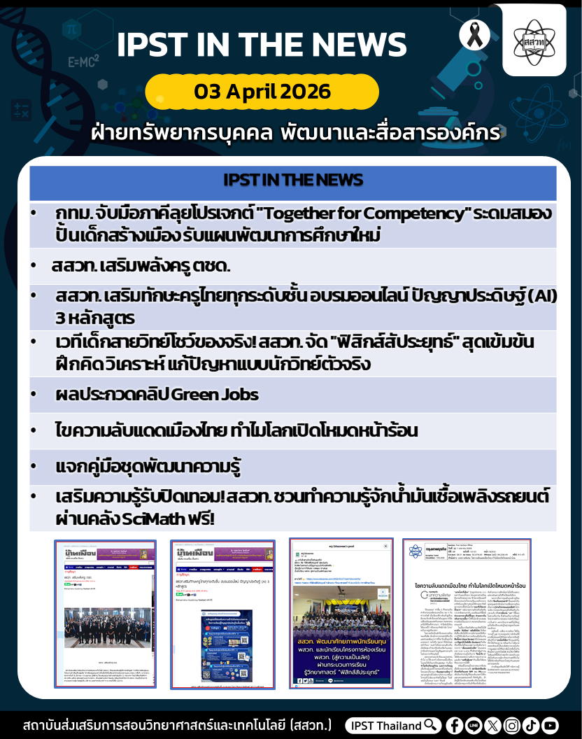 สถาบันส่งเสริมการสอนวิทยาศาสตร์และเทคโนโลยี (สสวท.) ได้ดำเนินงานตามภารกิจอย่างต่อเนื่อง รวมถึงได้ประชาสัมพันธ์ข่าวสารเพื่อให้ครู นักเรียน ผู้ปกครอง และประชาชนทั่วไป ได้รับทราบ เข้าถึงสื่อ ผลงาน กิจกรรม และข่าวต่าง ๆ สสวท. ขอประชาสัมพันธ์ข่าวประจำสัปดาห์ (IPST IN THE NEWS) ระหว่างวันที่ 30 มีนาคม – 3 เมษายน 2569 รายละเอียดดังนี้