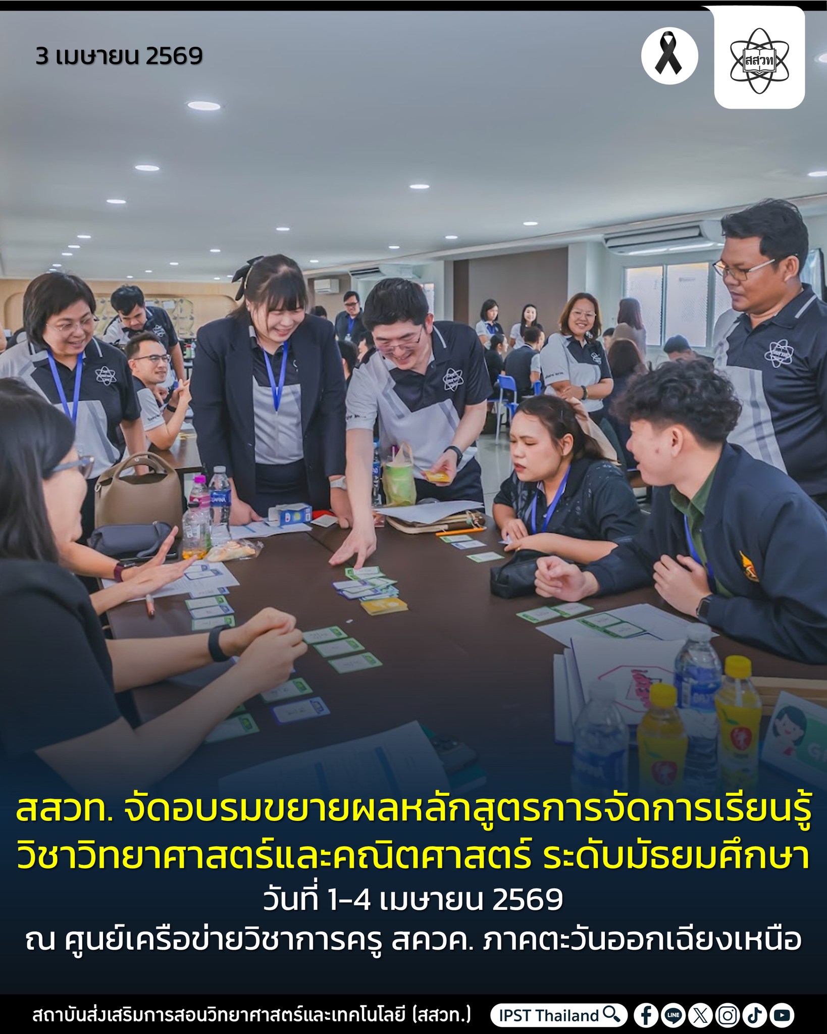สถาบันส่งเสริมการสอนวิทยาศาสตร์และทเคโนโลยี (สสวท. เดินหน้าพัฒนาศักยภาพครูไทย! นำร่องเปิดการอบรมเชิงปฏิบัติการขยายผลหลักสูตรการจัดการเรียนรู้วิชาวิทยาศาสตร์และคณิตศาสตร์ ระดับมัธยมศึกษา ประเดิมที่แรก ณ ศูนย์เครือข่ายวิชาการครู สควค. ภาคตะวันออกเฉียงเหนือ โรงเรียนวิทยาศาสตร์จุฬาภรณราชวิทยาลัย จ.บุรีรัมย์ ระหว่างวันที่ 1-4 เมษายน 2569 โดยมี รศ.ดร.ธีระเดช เจียรสุขสกุล ผู้อำนวยการ สสวท. เป็นประธานเปิดงาน พร้อมเน้นย้ำเทรนด์การศึกษาปัจจุบันที่ต้องก้าวให้ทันโลก โดยเฉพาะ การนำ AI มาช่วยจัดการเรียนรู้ และ การปลูกฝังจิตสำนึกรักษ์สิ่งแวดล้อม ให้กับนักเรียน