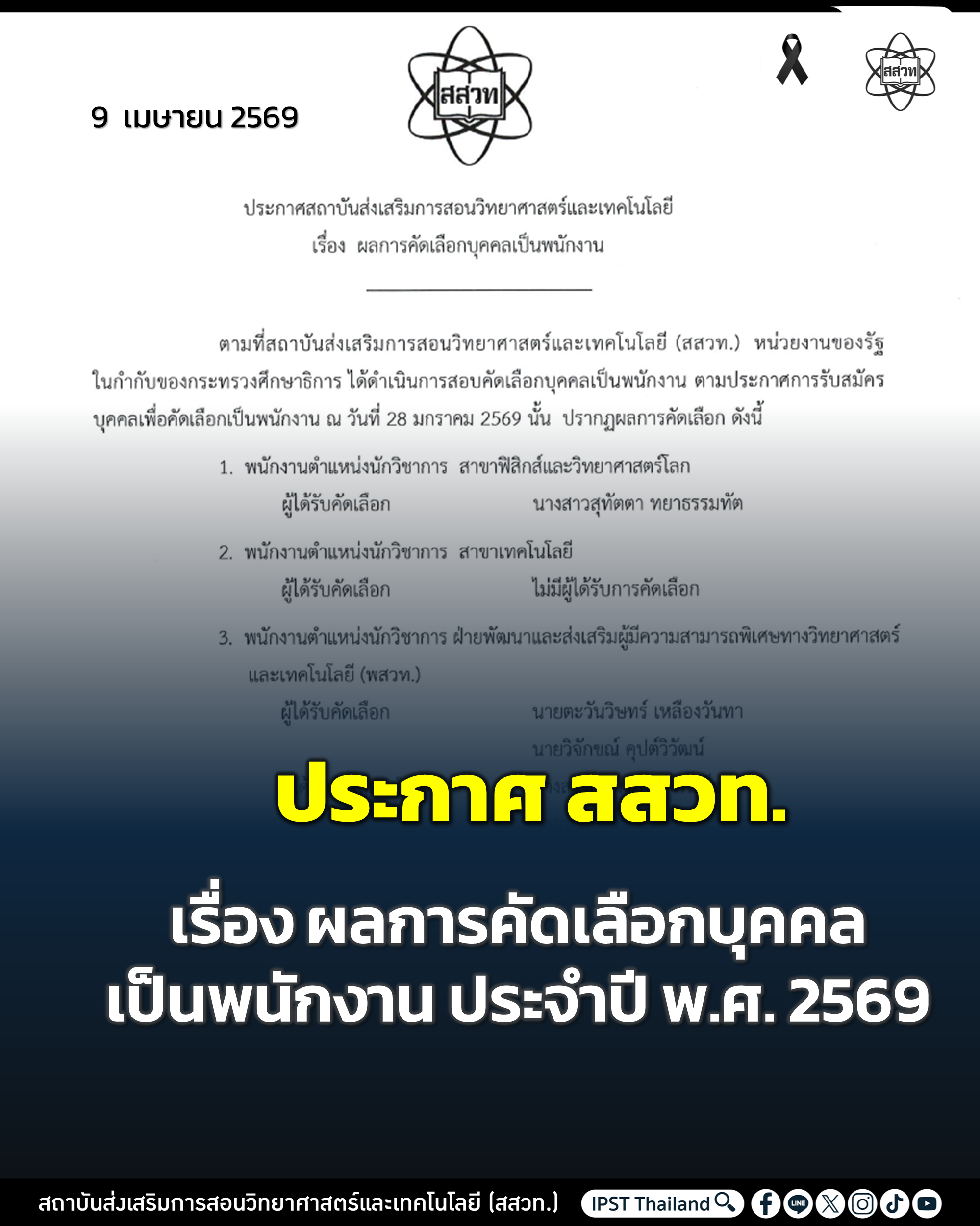 สถาบันส่งเสริมการสอนวิทยาศาสตร์และเทคโนโลยี (สสวท.) ประกาศผลการคัดเลือกบุคคลเป็นพนักงาน ประจำปี 2569 จากการสอบคัดเลือกเมื่อวันที่ 28 มกราคม 2569 โดยมีผู้ผ่านการคัดเลือกในตำแหน่งนักวิชาการ สาขาฟิสิกส์และวิทยาศาสตร์โลก จำนวน 1 ราย ตำแหน่งนักวิชาการ ฝ่ายพัฒนาและส่งเสริมผู้มีความสามารถพิเศษทางวิทยาศาสตร์และเทคโนโลยี (พสวท.) จำนวน 2 ราย และผู้ผ่านการคัดเลือกสำรอง 2 ราย นอกจากนี้ ยังมีผู้ผ่านการคัดเลือกในตำแหน่งเจ้าหน้าที่ ฝ่ายยุทธศาสตร์ แผน และประกันคุณภาพ และตำแหน่งเจ้าหน้าที่ ฝ่ายจัดซื้อ พัสดุ และอาคารสถานที่ ตำแหน่งละ 1 ราย ทั้งนี้ ผู้ผ่านการคัดเลือกและผู้ผ่านการคัดเลือกสำรองสามารถติดต่อรายงานตัวได้ตามวัน เวลา และสถานที่ ที่กำหนด ณ ฝ่ายทรัพยากรบุคคล พัฒนาและสื่อสารองค์กร สสวท. โทร. 0 2392 4021 ต่อ 4253 ในวันและเวลาราชการ อ่านรายละเอียดตามประกาศที่แนบ