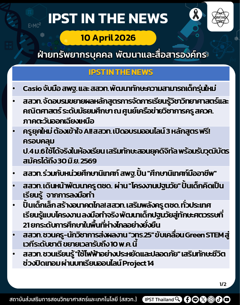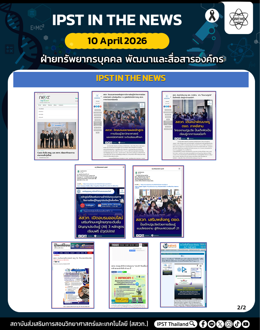 สถาบันส่งเสริมการสอนวิทยาศาสตร์และเทคโนโลยี (สสวท.) ได้ดำเนินงานตามภารกิจอย่างต่อเนื่อง รวมถึงได้ประชาสัมพันธ์ข่าวสารเพื่อให้ครู นักเรียน ผู้ปกครอง และประชาชนทั่วไป ได้รับทราบ เข้าถึงสื่อ ผลงาน กิจกรรม และข่าวต่าง ๆ สสวท. ขอประชาสัมพันธ์ข่าวประจำสัปดาห์ (IPST IN THE NEWS) ระหว่างวันที่ 7 – 10 เมษายน 2569 รายละเอียดดังนี้
