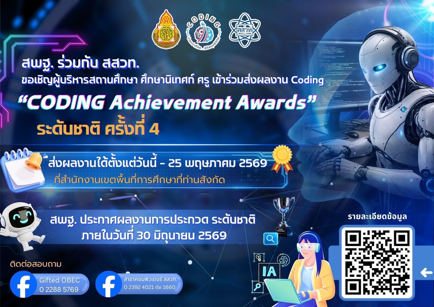 สถาบันส่งเสริมการสอนวิทยาศาสตร์และเทคโนโลยี (สสวท.) ร่วมกับสำนักงานคณะกรรมการการศึกษาขั้นพื้นฐาน (สพฐ.) ขอเชิญผู้บริหารสถานศึกษา ศึกษานิเทศก์ และครูผู้สอนในสังกัด สพฐ. ทั่วประเทศ ร่วมส่งผลงานเข้าประกวดในเวทีระดับชาติ “CODING Achievement Awards” ครั้งที่ 4 เพื่อเผยแพร่และแลกเปลี่ยนองค์ความรู้ด้าน Coding & AI พร้อมคัดเลือกผลงานต้นแบบและยกย่องเชิดชูเกียรติบุคลากรทางการศึกษาโดยผู้มีสิทธิ์ส่งผลงานต้องสังกัดหน่วยงานใน สพฐ. และส่งผลงานผ่านสำนักงานเขตพื้นที่การศึกษาที่สังกัด (สพท.) ภายในวันที่ 25 พฤษภาคม 2569 ก่อนเข้าสู่กระบวนการคัดเลือกระดับเขตภายในวันที่ 8 มิถุนายน 2569 และประกาศผลระดับชาติภายในวันที่ 30 มิถุนายน 2569 ทั้งนี้ ผลงานที่ได้รับการคัดเลือกจะได้ร่วมจัดแสดงและรับรางวัลในวันที่ 24–26 กรกฎาคม 2569 ณ มหาวิทยาลัยราชภัฏราชนครินทร์ ศึกษารายละเอียด หลักเกณฑ์ และเงื่อนไขการส่งผลงานเพิ่มเติมได้ที่เว็บไซต์ https://oho.ipst.ac.th/ai/prcoding69 และ Facebook สาขาคอมพิวเตอร์ สสวท. https://web.facebook.com/oho.ipst