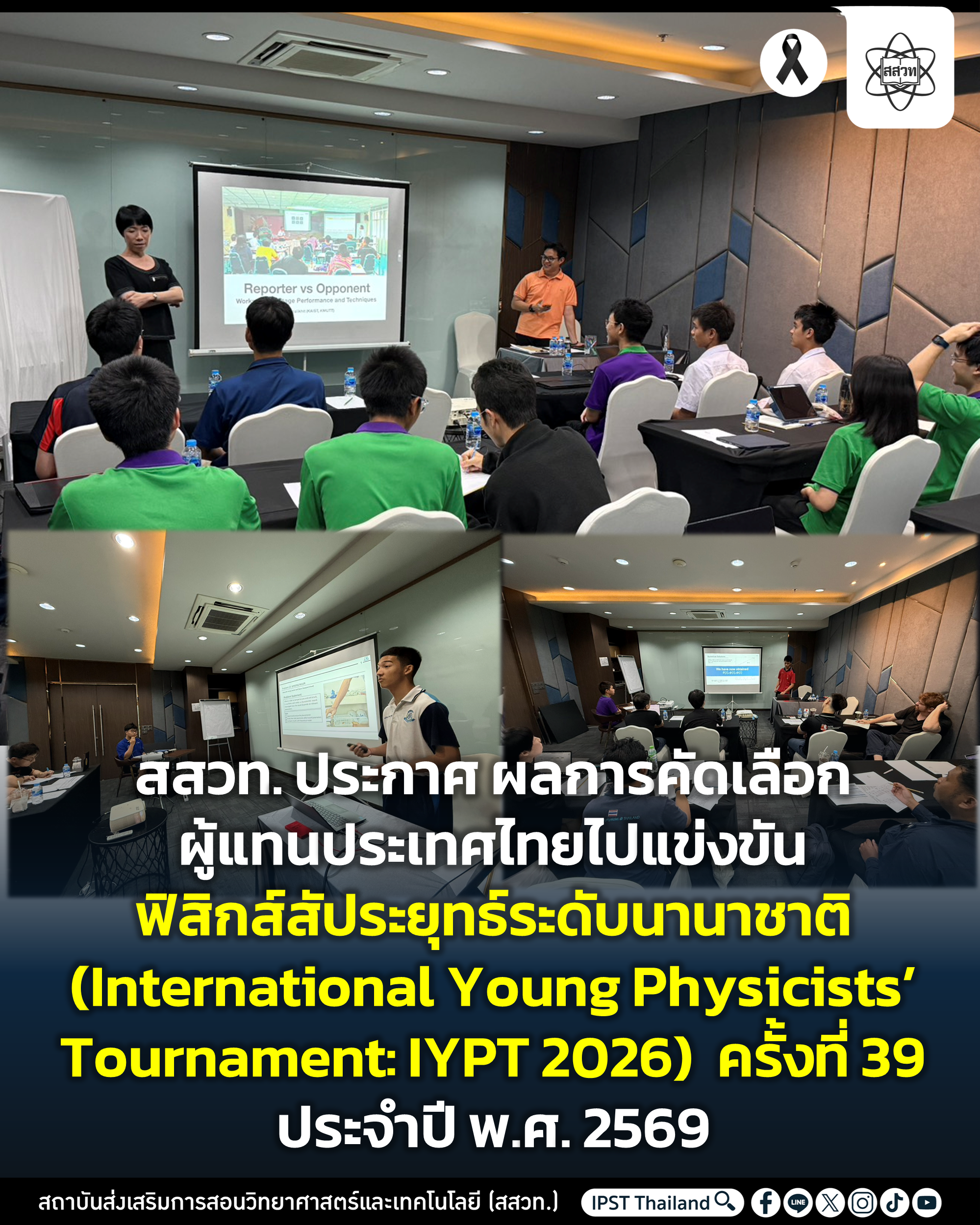 สถาบันส่งเสริมการสอนวิทยาศาสตร์และเทคโนโลยี (สสวท.) ประกาศผลการคัดเลือกนักเรียนผู้แทนประเทศไทยเข้าร่วมการแข่งขันฟิสิกส์สัประยุทธ์ระดับนานาชาติ International Young Physicists’ Tournament (IYPT 2026) ครั้งที่ 39 ซึ่งจะจัดขึ้น ณ เมืองซูริค สมาพันธรัฐสวิส หลังผ่านกระบวนการคัดเลือกอย่างเข้มข้นในค่ายพัฒนาทักษะการวิจัยด้วยโจทย์ฟิสิกส์สัประยุทธ์ ครั้งที่ 2 ระหว่างวันที่ 3–5 เมษายน 2569 ณ โรงแรมเดอ ไพรม์ รางน้ำ โดยผู้เข้าอบรมได้ฝึกทักษะผ่านกิจกรรม “Physics Fight 2” ที่ดำเนินการแข่งขันเป็นภาษาอังกฤษตลอดช่วงคัดเลือด เพื่อเสริมศักยภาพทั้งด้านวิชาการและการสื่อสารในระดับนานาชาติ