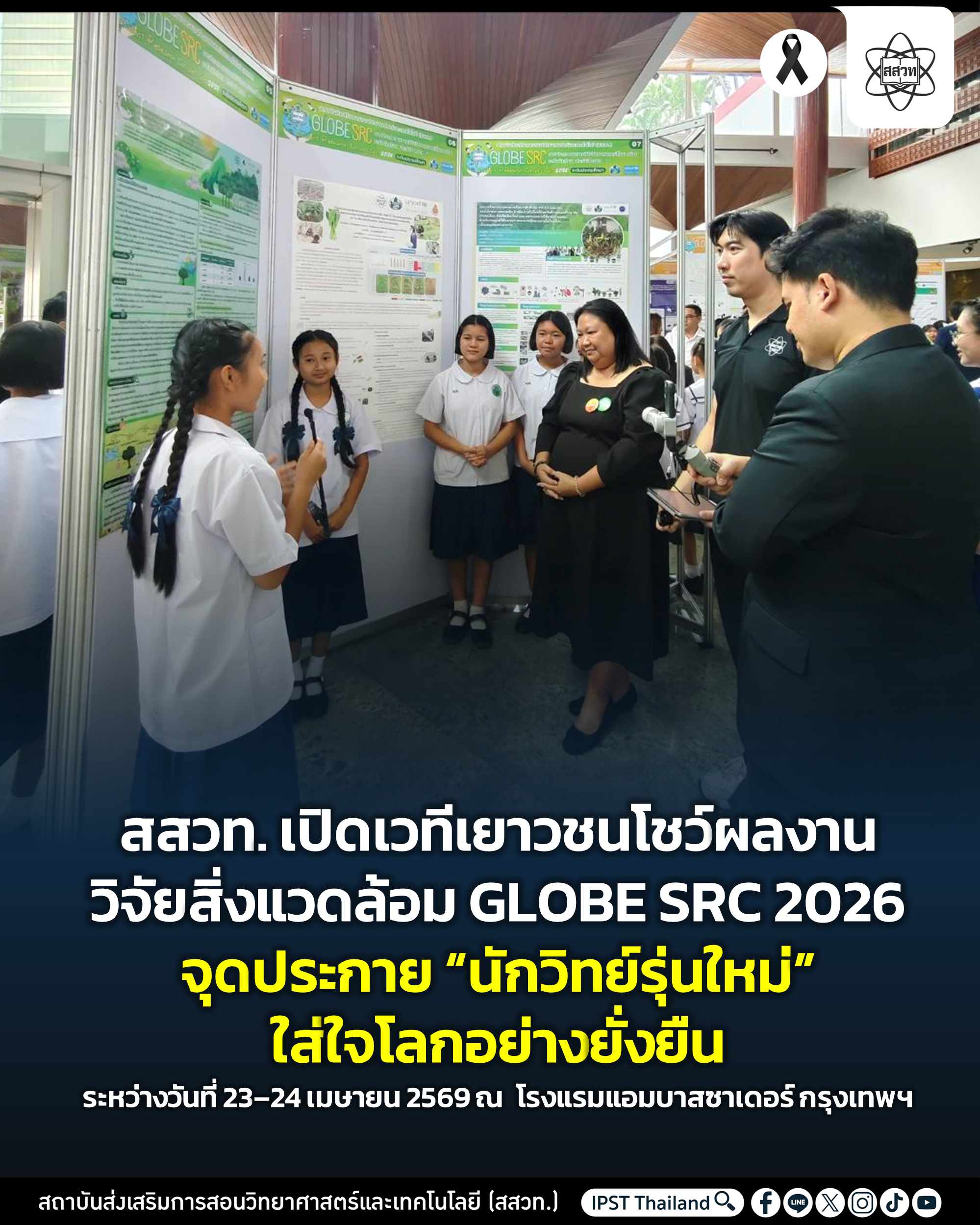 สถาบันส่งเสริมการสอนวิทยาศาสตร์และเทคโนโลยี (สสวท.) จัดการประกวดผลงานวิจัยวิทยาศาสตร์สิ่งแวดล้อม GLOBE Student Research Competition (GLOBE SRC) 2026 รอบตัดสิน ระหว่างวันที่ 23–24 เมษายน 2569 ณ ห้องประชุม Convention AB โรงแรมแอมบาสซาเดอร์ กรุงเทพฯ เวทีที่เปิดโอกาส