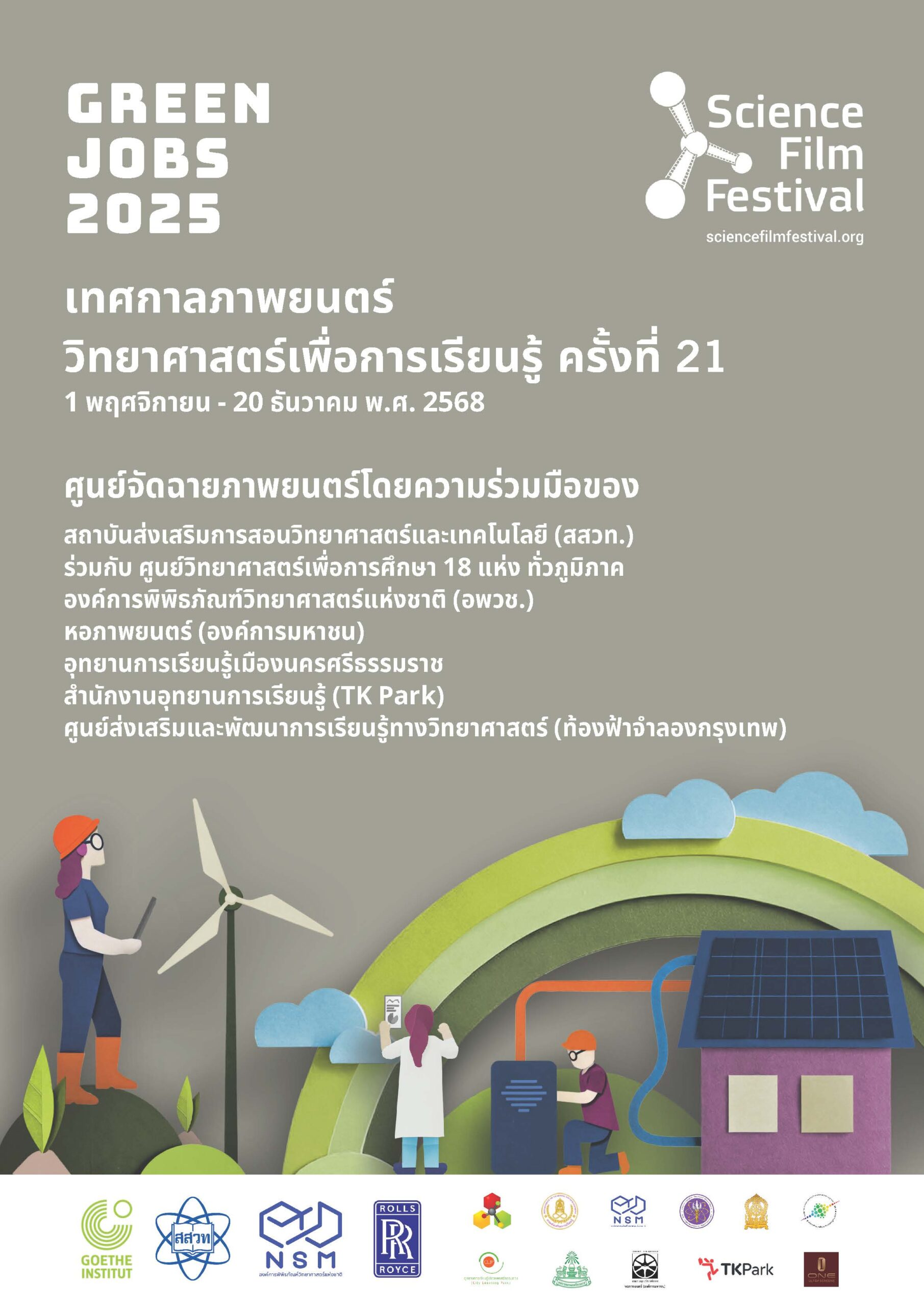 The Institute for the Promotion of Teaching Science and Technology (IPST), in collaboration with Science Centers for Education nationwide, invites teachers, students, youth, and the general public to join the 21st Science Film Festival and enjoy films and creative learning activities at film screening centers across the country! The festival runs from 1 November to 20 December 2025, under the theme “Green Jobs”. Discover inspiration from science films from around the world that explore “Green Jobs”, future career paths that will help drive the world towards sustainability, reduce carbon dioxide emissions, and build a better future through science and technology.