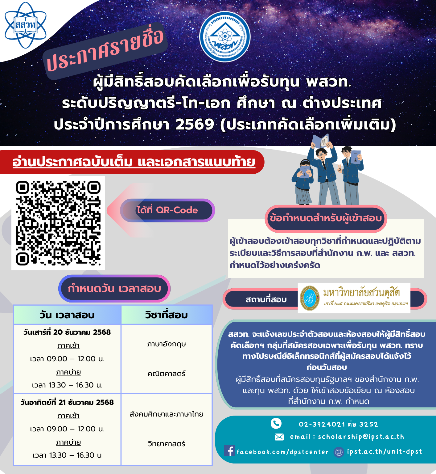 📌📌ขอให้ผู้มีสิทธิ์สอบคัดเลือกฯ ตามรายชื่อในประกาศฯ เข้าสอบข้อเขียนในการจัดสอบแข่งขันและคัดเลือกบุคคลเพื่อรับทุนรัฐบาล ฯ ไปศึกษาวิชา ณ ต่างประเทศ ประจำปี 2569 (ทุนระดับมัธยมศึกษาตอนปลาย) ของสำนักงาน ก.พ. ในวันเสาร์ที่ 20 – วันอาทิตย์ที่ 21 ธันวาคม 2568 ณ มหาวิทยาลัยสวนดุสิต กรุงเทพฯ โดย สสวท. จะแจ้งเลขประจำตัวสอบและห้องสอบให้ผู้มีสิทธิ์สอบคัดเลือกฯ กลุ่มที่สมัครสอบเฉพาะเพื่อรับทุน พสวท. ทราบ ทางไปรษณีย์อิเล็กทรอนิกส์ที่ผู้สมัครสอบได้แจ้งไว้ก่อนวันสอบ