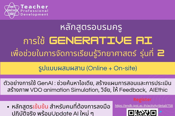 ครูห้ามพลาด! สสวท. ชวนอบรม Generative AI รุ่นที่ 2 เรียนออนไลน์ พร้อมเวิร์กชอปเข้มข้น On-site ฟรี เสริมพลังจัดการเรียนรู้วิทยาศาสตร์ยุคใหม่ 12 มีนาคม 2569 แก้ไขล่าสุดเมื่อ: (แก้ไข 14 มีนาคม 2026)