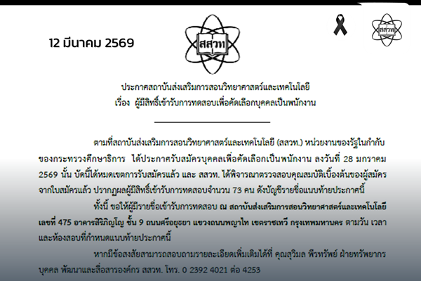 ประกาศ สสวท. เรื่อง ผู้มีสิทธิ์เข้ารับการทดสอบเพื่อคัดเลือกบุคคลเป็นพนักงาน 12 มีนาคม 2569 แก้ไขล่าสุดเมื่อ: (แก้ไข 12 มีนาคม 2026)