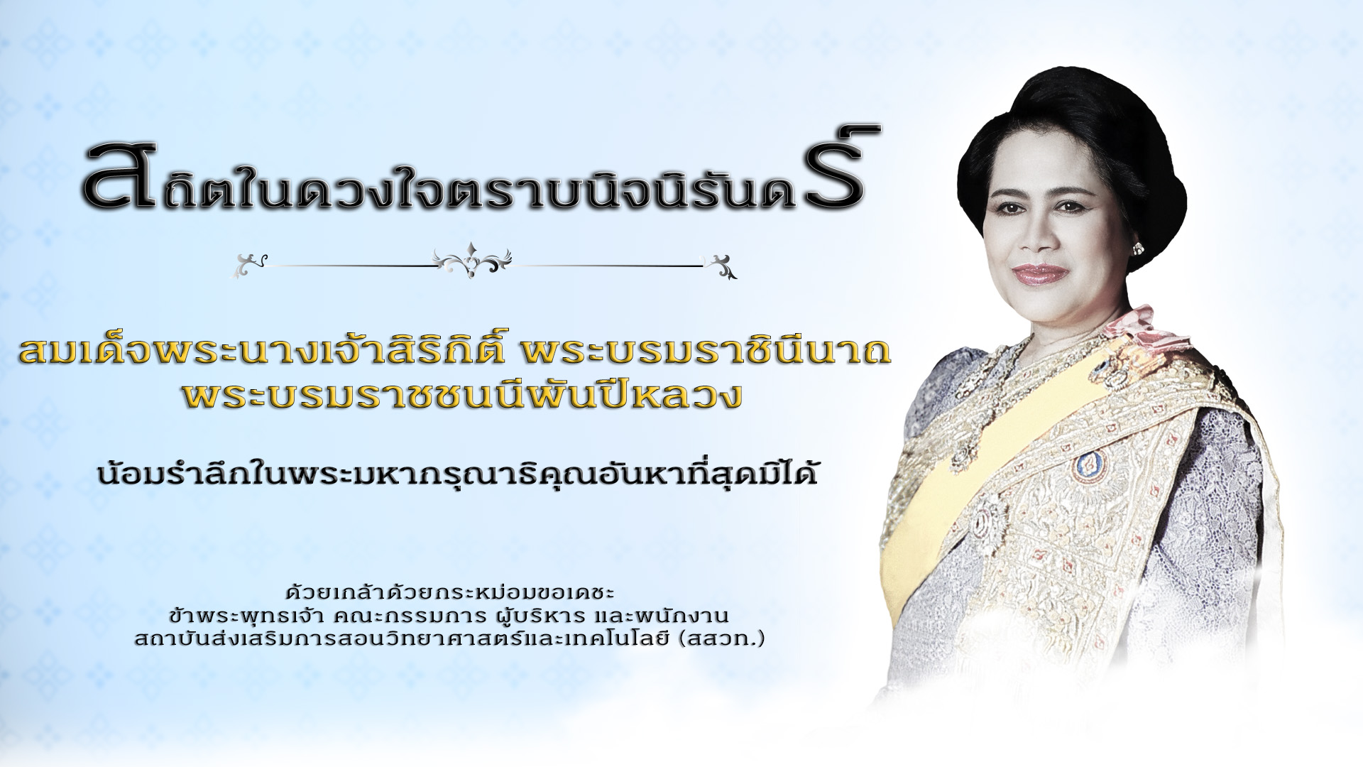 สมเด็จพระนางเจ้าสิริกิติ์ พระบรมราชินีนาถ พระบรมราชชนนีพันปีหลวง ๏ พระราชกรณียกิจด้านวิทยาศาสตร์และเทคโนโลยี ๏ ข่าวประชาสัมพันธ์ น้อมสำนึกในพระมหากรุณาธิคุณ สมเด็จพระนางเจ้าสิริกิติ์ พระบรมราชินีนาถ พระบรมราชชนนีพันปีหลวง ขอน้อมรำลึกในพระมหากรุณาธิคุณอย่างหาที่สุดมิได้ ในพระราชกรณียกิจอันทรงคุณูปการต่อประเทศชาติด้านวิทยาศาสตร์และเทคโนโลยีกับโครงการในพระราชดำริ สมเด็จพระบรมราชชนนีพันปีหลวง สสวท. ร่วมพิธีบำเพ็ญกุศลปัณรสมวาร 15 วัน ถวายเป็นพระราชกุศลแด่สมเด็จพระนางเจ้าสิริกิติ์ พระบรมราชินีนาถ พระบรมราชชนนีพันปีหลวง ณ กระทรวงศึกษาธิการ สสวท. จัดพิธีถวายความอาลัย น้อมรำลึกในพระมหากรุณาธิคุณ สมเด็จพระนางเจ้าสิริกิติ์ พระบรมราชินีนาถ พระบรมราชชนนีพันปีหลวง